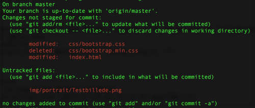 De første filer som står med rød skrift er dem i har lavet ændringer i. I kan godkende at ændringer i en fil skal være med i „skubbet“ til jeres hjemmeside ved at skrive git add FILEPATH . Hvis jeg fx. vil godkende at bootstrap.min.css skal slettes kan jeg skrive